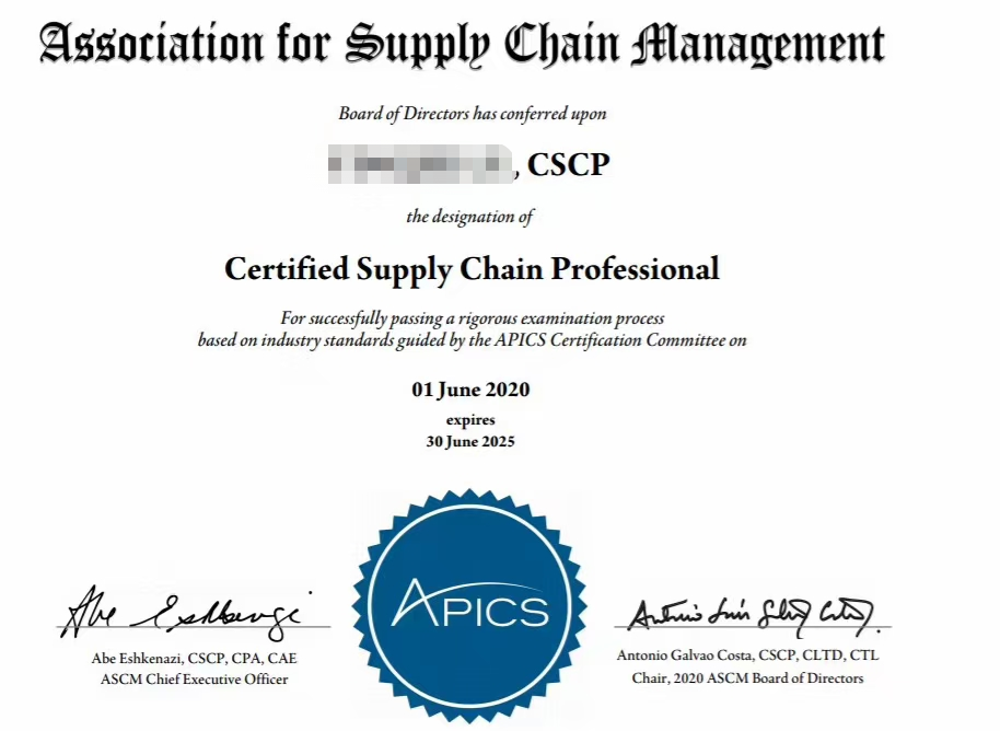 ■ 考试时间:每天都有考试,随时可以考,为了保证考点席位,建议提前1个月约考点 ■ 考试形式:纯英文教材+考试,机考,150个单选题,3.5小时,300分通过,满分350分 覆盖一二线考试城市近百个 https://home.pearsonvue.com/apics 进入页面后,点击”Login”下方”Find a test center”查看考点 ■ 考试成绩:考完当场出成绩,可在APICS官网打印成绩单和证书 CSCP(Certified Supply Chain Professional),中文名称叫端到端供应链经理专业认证,是国际上第一个供应链管理专业资格权威认证。CSCP认证拓展了APICS在运营领域的知识体系,从企业内部的运营管理延伸到企业外部的供应链,涵盖了从企业组织的内部作业到整个供应链的所有层面。CSCP一经推出,就受到了高级供应链管理人员和咨询师的追捧 。 1 .根据2024年11月12日上海市人力资源和社会保障局最新发布, CSCP是上海市境外职业资格证书认可清单-A类 ,具体请复制链接到浏览器查看:https://www.shanghai.gov.cn/gwk/search/content/t0035_1428868